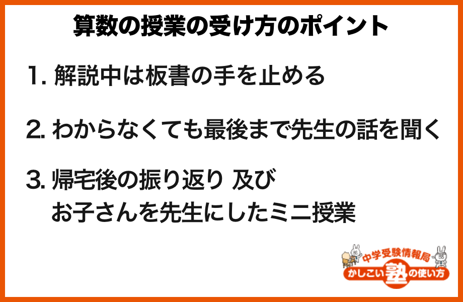 中学受験の進学塾の算数の授業で注意していただきたいことは大きく3つあります。
