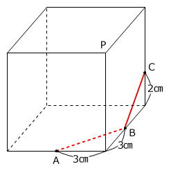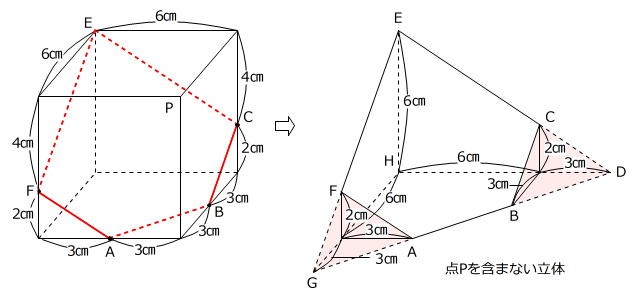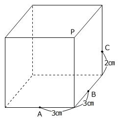 【問題】図のような1辺の長さが6㎝の立方体があります。この立方体を図の3つの点A、B、Cを通る平面で切断します。切断してできる2つの立体のうち、点Pをふくむ立体の体積を求めなさい。