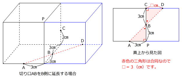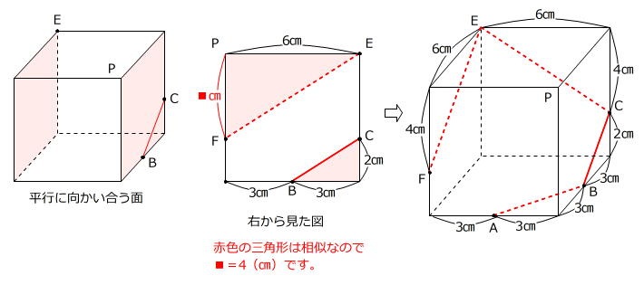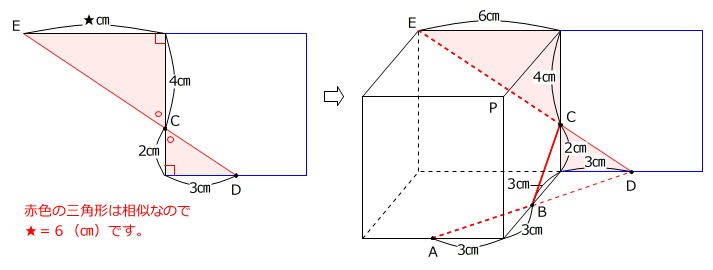 CDとCDを延長してできる2つの赤色の三角形は相似なので ★=6㎝(左下図)となり、点Eは立方体の頂点と重なります。(右下図)