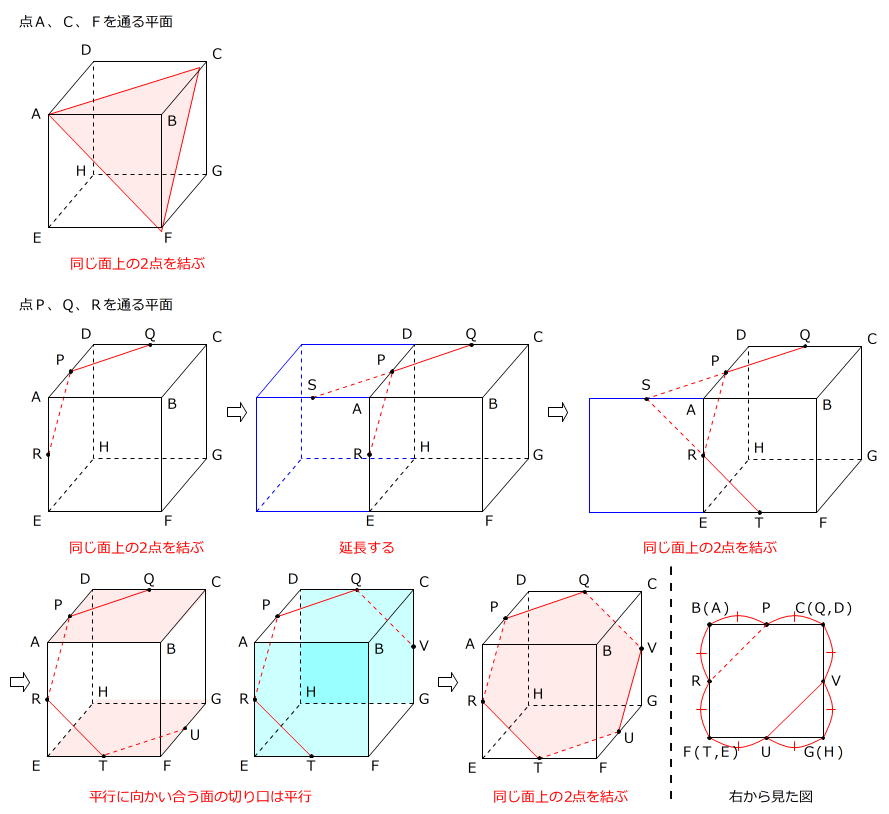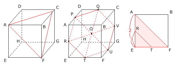 上の図のように、点A、C、Fを通る平面で切断したときの切断面はAFを1辺とする正三角形、点P、Q、Rを通る平面で切断したときの切断面は辺RTを1辺とする正六角形です。
