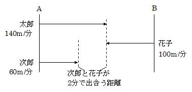 太郎くんと次郎くんはAからBに向かって、花子さんはBからAに向かって同時に進み始めると、太郎くんと花子さんが出会ってから2分後に、次郎くんと花子さんが出会いました。3人の進む速さはそれぞれ、太郎くんが分速140m、次郎くんが分速60m、花子さんが分速100mです。AB間の距離は何mですか。