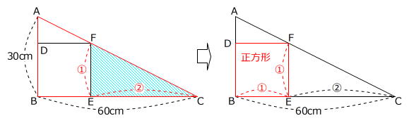B-3 下の図のように直角三角形ABCの中に正方形DBEFを作るとき、この正方形の1辺の長さは何cmですか。