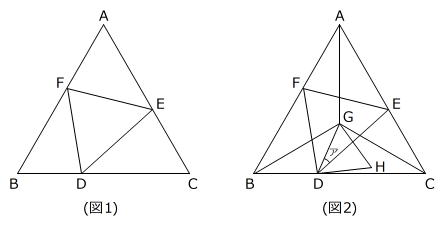 ② さらに(図2)のように、AG=BG=CGとなる点Gをとります。三角形GDHは正三角形です。角アの大きさは何度ですか。