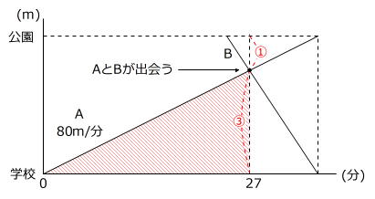Aさんは徒歩で学校から公園に向かって出発しました。BさんはAさんより4分遅れて学校を出発し、自転車で学校と公園の間を往復しました。またCさんは、Aさんと同時に公園を出発し、走って学校に向かいました。Aさんは学校から公園までの距離の3/4の地点で、公園から戻ってきたBさんと出会いました。下の図はそのときの様子を表したものです。3人はそれぞれ一定の速さで進み、Aさんの歩く速さは毎分80mです。次の[ ]に当てはまる数を求めなさい。