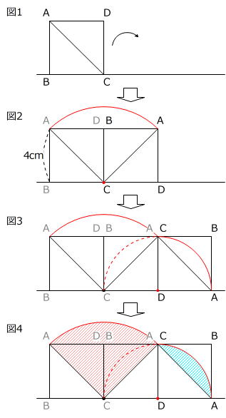 しかし、図3では「回転の中心から最も近い点」は対角線ACの真ん中の点(正方形ABCDの2本の対角線の交点)ですから、対角線ACが動いた部分は次のようになります。