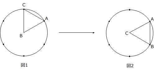 上の図のように、3回の回転で正三角形ABCは初めの位置(図1)と同じように、頂点Bが円の中心と重なりましたから、残り3回の回転は、はじめ3回の回転と同じ動きをすることになります。