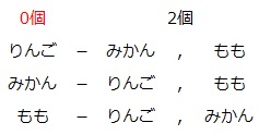 「2個」の果物が2種類、「0個」の果物が1種類ですから、種類が少ない「0個」の果物に着目すると、りんご、みかん、もものいずれかを0個にする3通りがあり、そのそれぞれについて「2個」の果物が1通りあります。