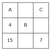 【問題】たて、横、ななめに並んでいる3つの数の合計がすべて等しくなる表があります。このとき、下の表のB、Cにあてはまる数を求めなさい。