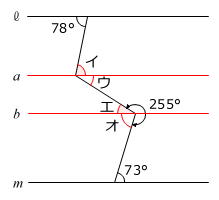 78度の角とイ、ウとエ、オと73度の角は、それぞれ錯角の関係ですから、イ=78度、ウ=エ、オ=73度です。