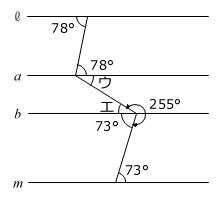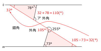 エ=360度-(255度+73度)=32度=ウ