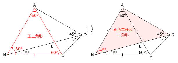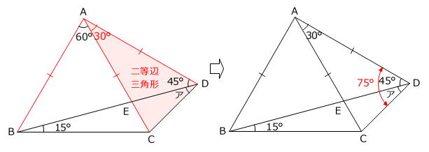 角ア=角ADC-角ADB=75度-45度=30度