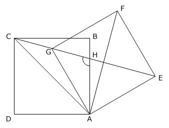 【問題】下の図は、同じ大きさの2つの正方形を組み合わせたものです。点Gは直線CE上にあります。このとき、角AHCの大きさは何度ですか。