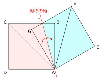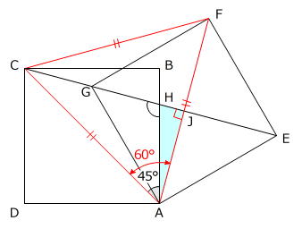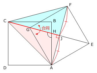 三角形ACJと、線対称な位置にある2点C、Fを直線で結んでできる三角形FCJは、AFとEGが正方形AEFGの対角線なので垂直に交わり、角AJC=角FJC=90度 ですから、合同な直角三角形です。