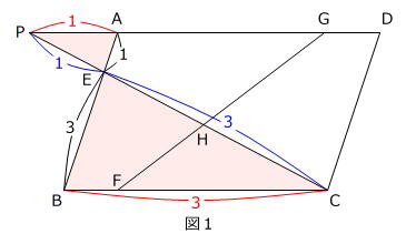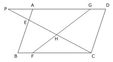 CEの延長とDAの延長が交わる点をPとします。PA:BC=[ア]:[イ]です。また、PG:FC=[ウ]:[エ]ですから、AG:GD=[オ]:[カ]です。