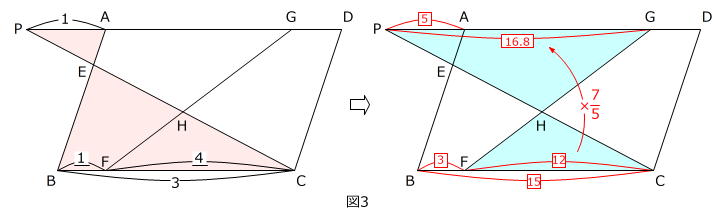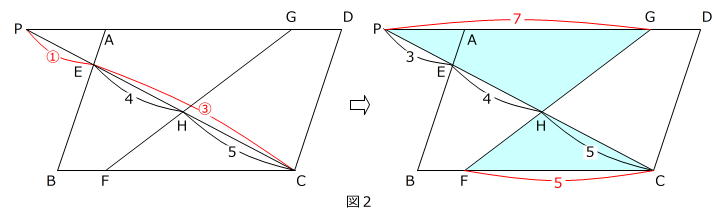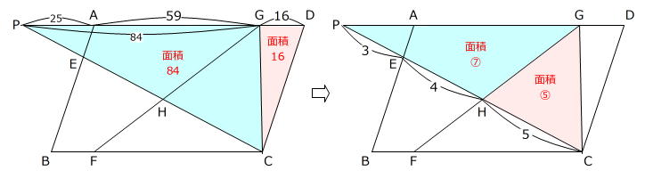 ですから、三角形GHPの面積を⑦とすると三角形GHCは⑤です。(右下図)