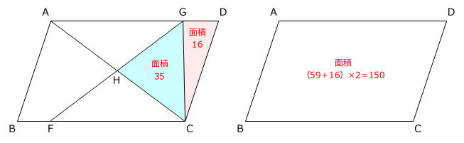 三角形GCDの面積は三角形ACDの面積の[キ]倍です。よって、四角形GHCDの面積は平行四辺形ABCDの面積の[ク]倍です。