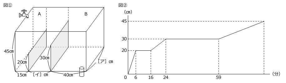 【問題】下の図①のように、水そうの中に2つの仕切りがあります。Aの部分にある蛇口から毎分3000㎤ずつ水を入れていきます。またBの部分には排水管があり、この部分に水が入っているとき、一定の割合で水が排出されます。水を入れはじめてから30分後に一度蛇口を閉めて水を止めました。その4分後に再び蛇口を開き、毎分3000㎤ずつ水を入れました。図②は水そうの中で最も高い水面の高さと時間の関係を表したグラフです。このとき、次の問いに答えなさい。ただし、水そうや仕切りの厚さは考えないものとします。