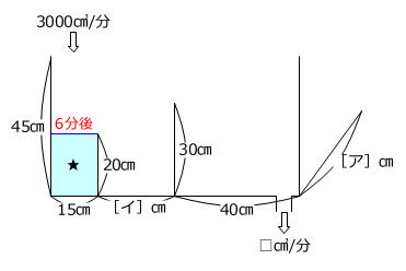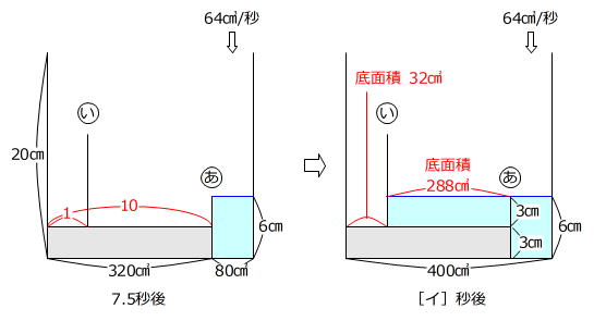 288㎠×3㎝=864㎤ … 7.5秒から[イ]秒後までに入る水の体積