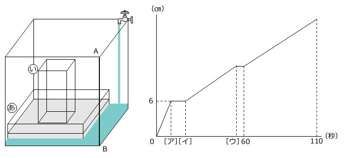 グラフが[ア]秒後に折れ曲がっていますから、直方体の台と水そう○あの高さの合計が6㎝とわかります。