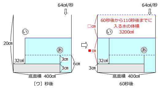 64㎤/秒×(110秒-60秒)=3200㎤ … 水の体積