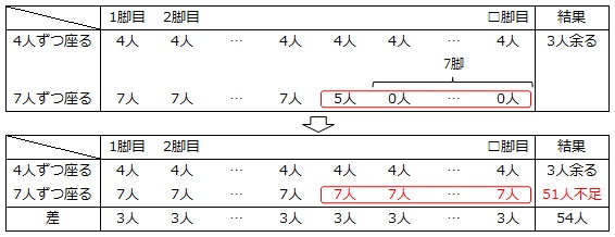 7人ずつ座る場合の空席は