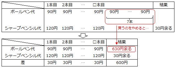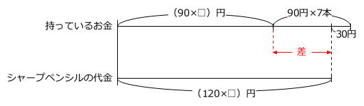 【問題】花子さんは90円のボールペンをちょうど何本か買えるお金を持っています。そのお金で120円のシャープペンシルを買うと、買える本数は90円のボールペンより7本少なくなり30円残ります。花子さんが持ってるお金はいくらですか。