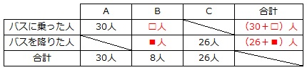Bから乗った人数を□人、Bで降りた人数を■人とします。