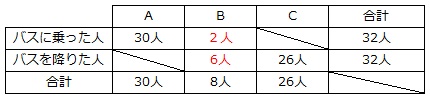よって、「乗り降り」が「A~B」の人が2人、「B~C」の人が6人、「A~C」の人が