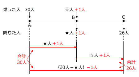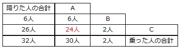 Bから乗った人がいないので、Cで降りた26人はAから乗った人ですから、Aから乗った残りの