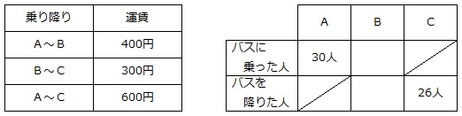 【問題】ある町では、3つの停留所A(始発)、B、C(終点)に停まるバスが運行していて、運賃は下の表の通りです。ある1回の運行では、Aで30人が乗り、Cでは乗っていた26人全員が降りました。