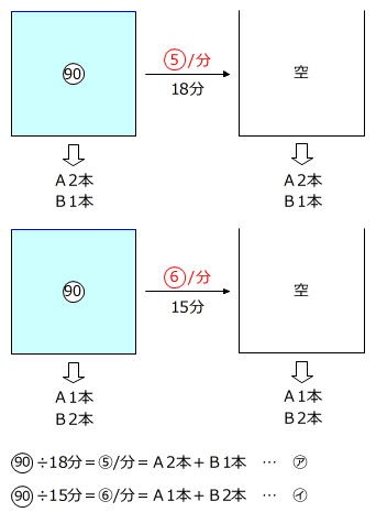 ここでは満水時の水量を時間(18分と15分)の最小公倍数である90○とし、1分あたりの水量の変化に着目します。
