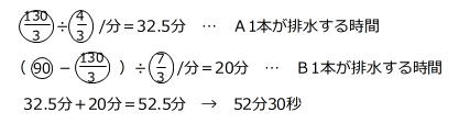 解答例では、全体の仕事量にあたる貯水タンクに入っている水の量を時間の最小公倍数としましたが、「排水量の合計=はじめに貯水タンクに入っていた水量+入ってくる水量の合計」のように考える解き方もあります。
