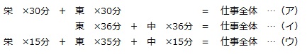 そこで、東さんが1分にする仕事量を 3/分、中さんが1分にする仕事量を 2/分 のように表すと、(イ)より仕事全体は