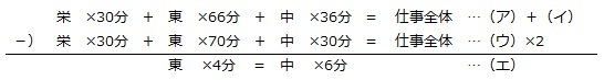 なお、解答例の他に、(ウ)を「栄さん×15分+東さん×15分+東さん×20分+中さん×15分=仕事全体」のように表し、(ア)からわかる「栄さん×15分+東さん×15分=仕事全体の1/2」を代入して「東さん×20分+中さん×15分=仕事全体の1/2」を導きだし、(イ)と比べるという方法もあります。