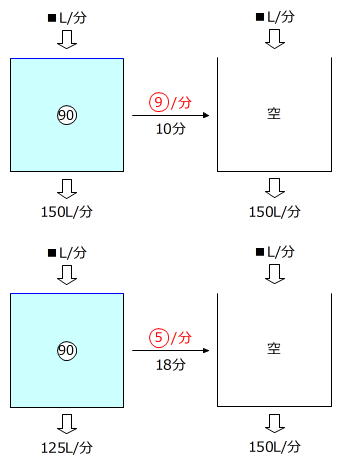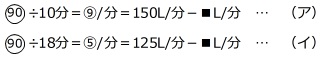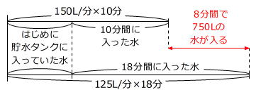 (125L/分×18分-150L/分×10分)÷(18分-10分)=93.75L … 1分間に入る水