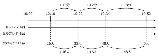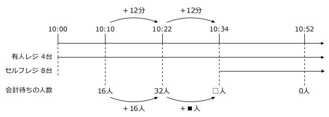 【問題】スーパーCは10時にオープンします。オープンと同時に有人レジ4台を開いたところ、10時10分に16人の客が会計をするために並んでいました。その後は毎分一定の客が並び、10時22分には32人の客が並んでしまったので、10時34分にこれまでの有人レジ4台に加えて、セルフレジ8台を開いたところ、10時52分には並んでいる客がいなくなりました。有人レジは、セルフレジの3/4倍の時間で通過でき、客がそれぞれのレジを通過する時間は全員同じものとします。